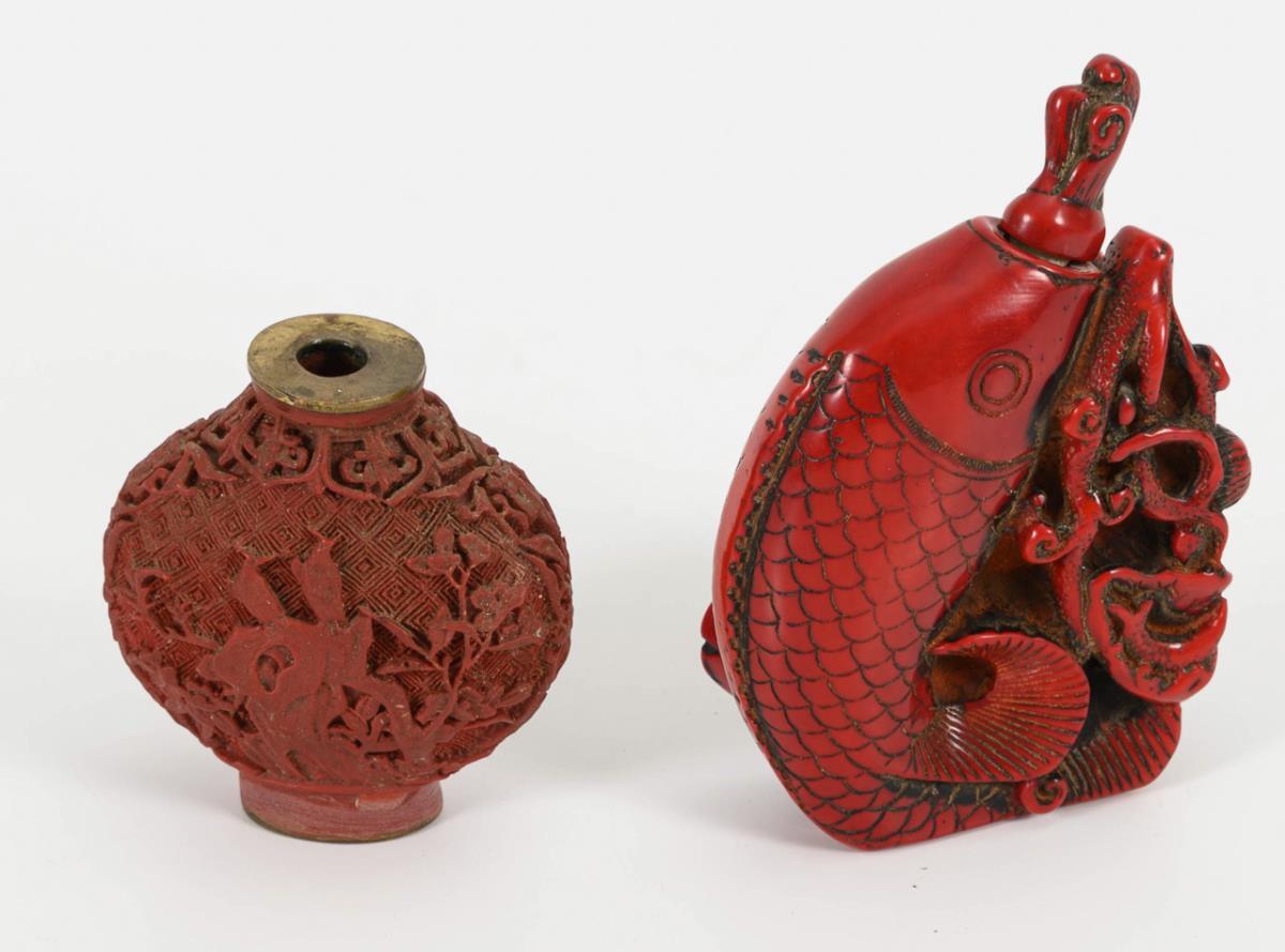 Fisch und Lotus in einer Einheit aus rot gefärbter Koralle mit Stöpsel. H 8,5 cm. / Geschnitzter Rotlack mit feinem Reliefdekor. Auf Unterseite in Messingplatte gemarkt, ohne Stöpsel, H 5,5 cm.