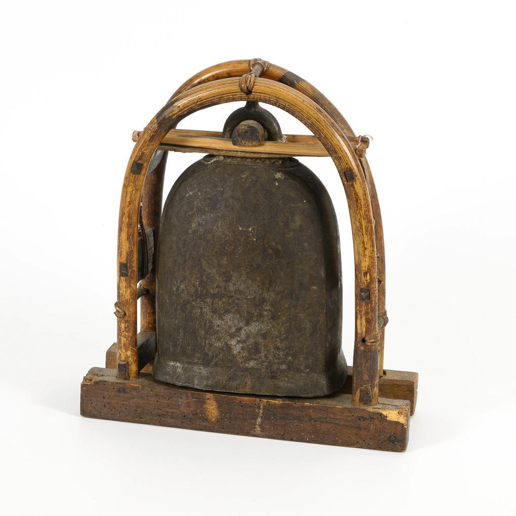 Metallglocke mit Holzklöppel, fest montiert in Rattangestell. Metallkörper mit kleiner Verzierung um die obere Öse.