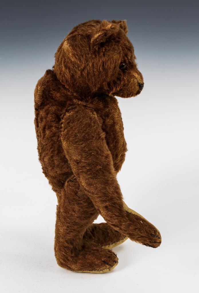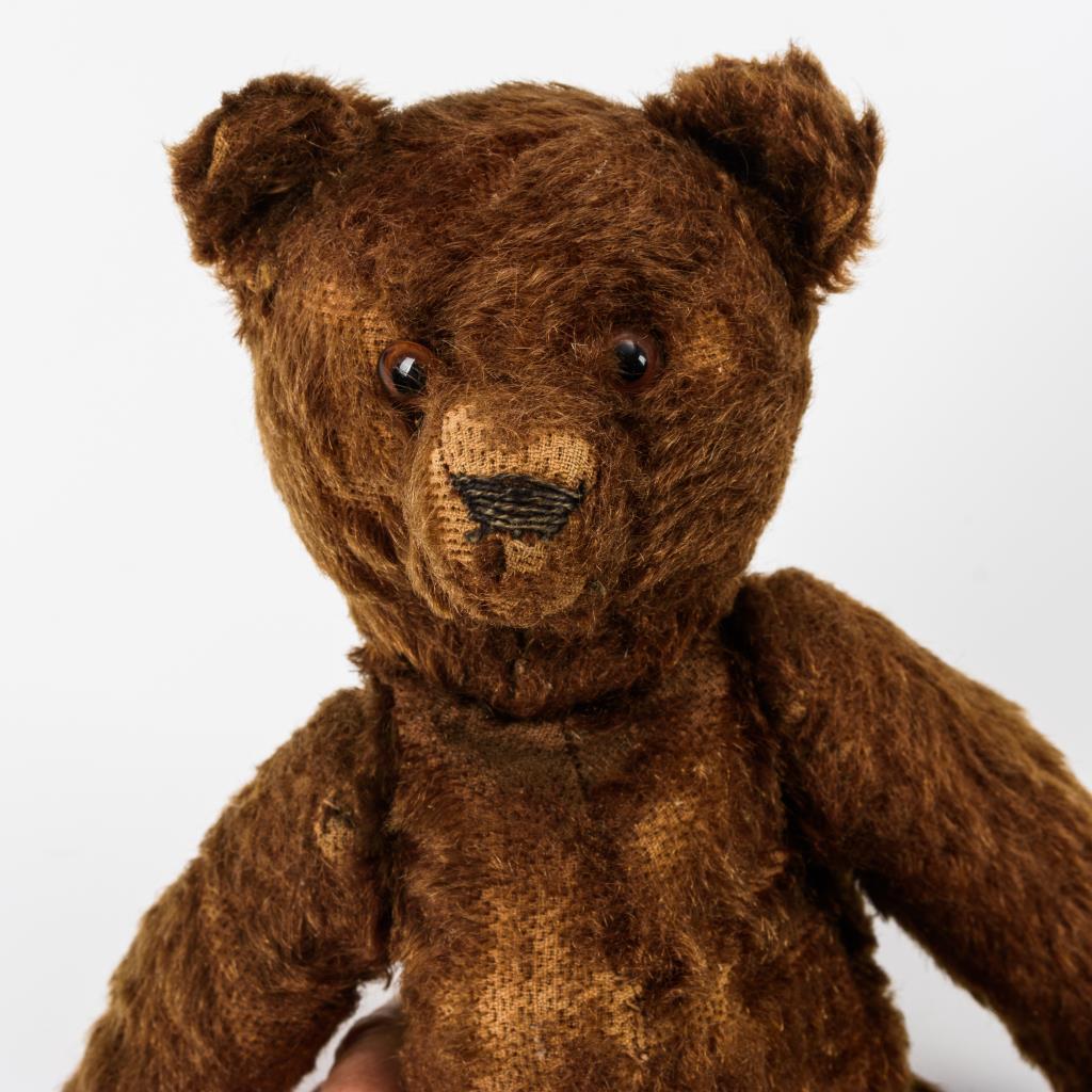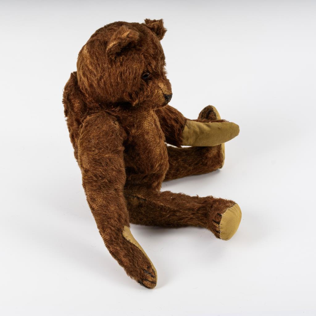 Mohairbär mit drehbarem Kopf, braunen Glasaugen und schwarz bestickter Nase. Körper mit Scheibengelenken und verstummter Stimme. Bespielt, leichter Fellverlust, Pfoten übernäht.