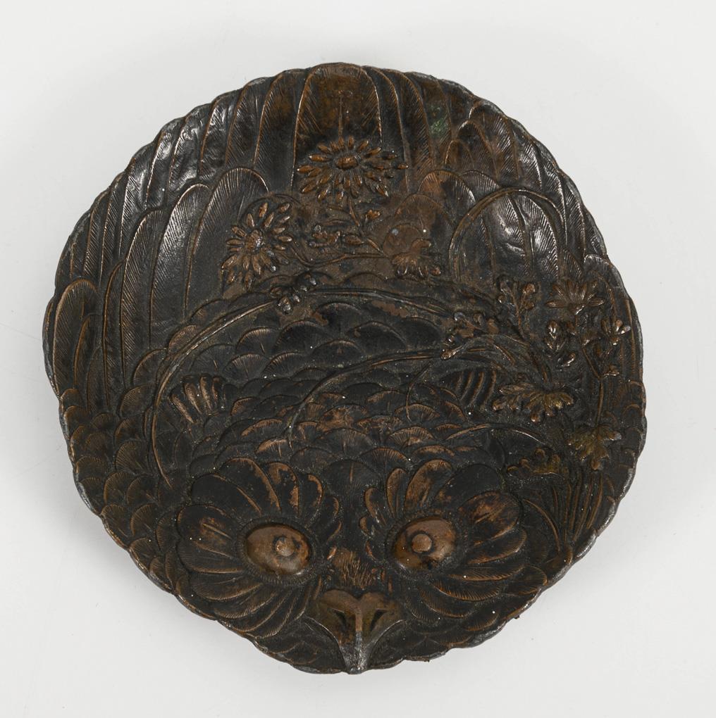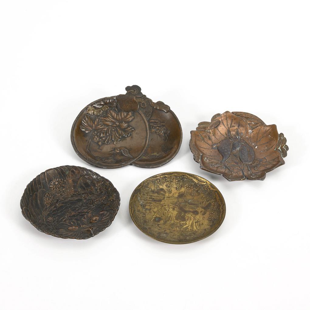 Kleine Schalen mit reliefierten Bildszenen: Eule und Blüten; Hirsch auf Blatt; Vogel und Blüte mit Fuji im Hintergrund und Mann und Frau bei der Feldarbeit, von Glyzinien eingefasst. Alters- und Gebrauchsspuren.
