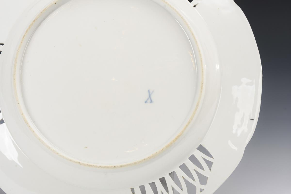 Teller mit Spalier-Reliefdekor und drei spitzbogenartig durchbrochen gearbeiteten Kartuschen auf der Fahne. Im Spiegel eine Raseninsel mit einer Ente, umgeben von Insekten und Streublümchen. Gold berieben,.