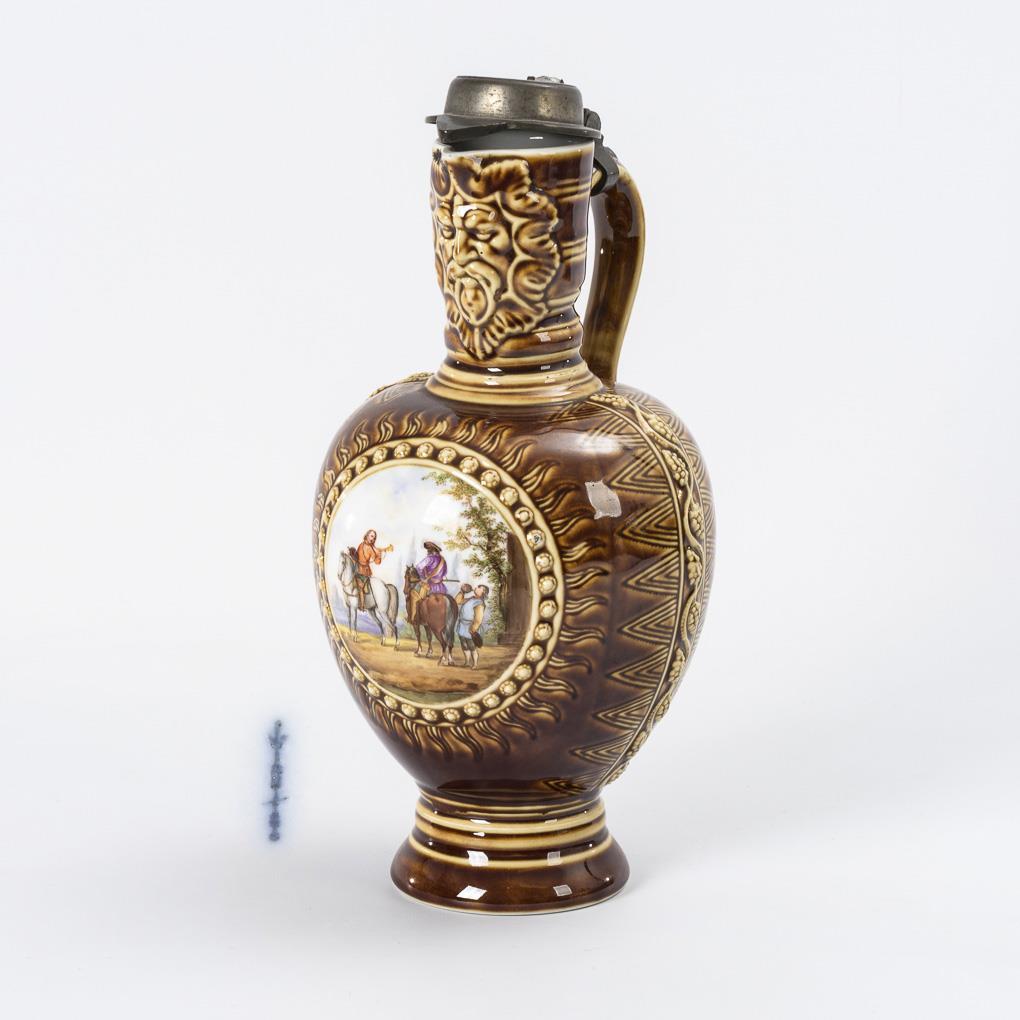 Polychrome Unter- und Aufglasurbemalung; Zinnmontierung. H 34 cm.