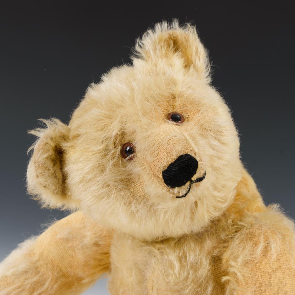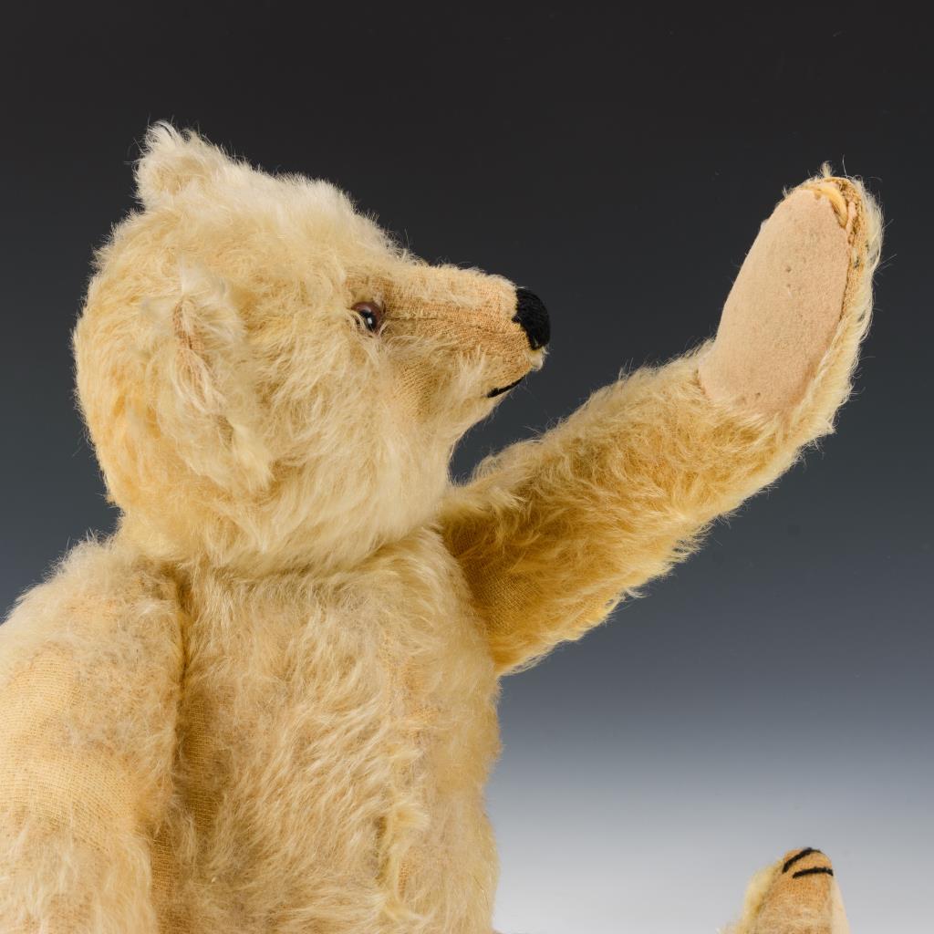 Mohairbär mit drehbarem Kopf, braunen Glasaugen. Körper mit intakter Stimme und Filzpfoten. Bespielt, partiell Fellverlust, Pfotenbezüge teils beschädigt, Bauchnaht neu (Stimme erneuert?), schwarze Nase nachgestickt.