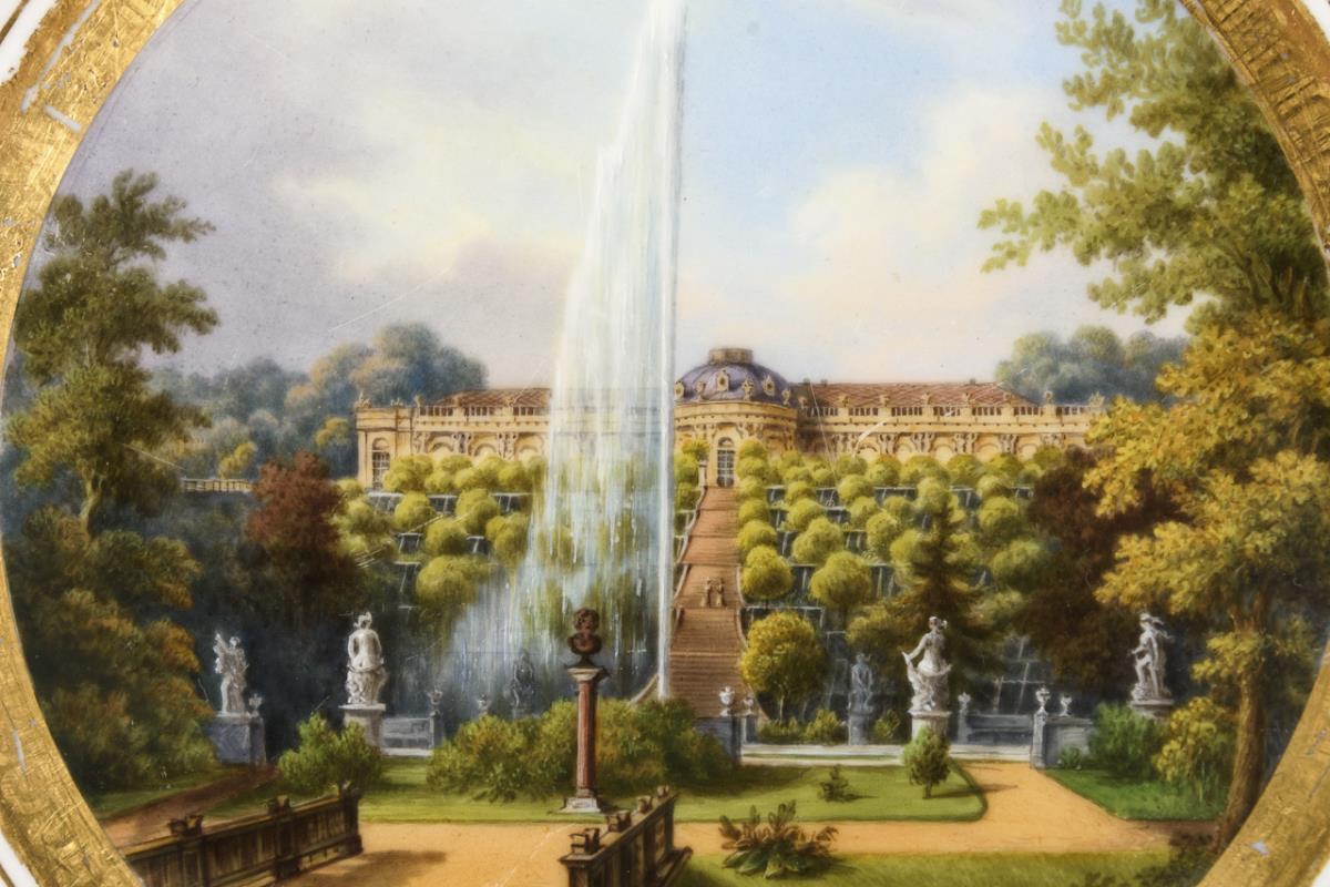 Teller mit der Ansicht des Schlosses Sanssouci mit Terrassen und Großer Fontäne, unterseitig bezeichnet "Schloss Sanssouci bei Potsdam". Gold etwas berieben.