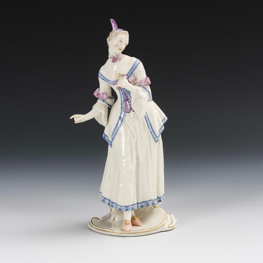 Auf einem Rocaillesockel stehende Rokokodame mit Rose. Rechte Hand und Feder restauriert.