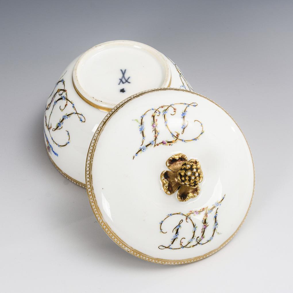 Bauchige Dose mit Fruchtknaufdeckel. Beidseitig das von Rosen und Vergißmeinnicht umrankte Monogramm "DJT". Gold etwas berieben.