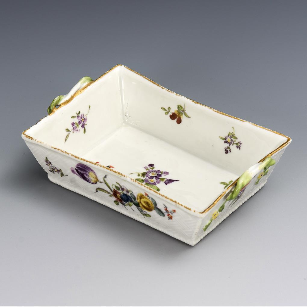 Kleine Rechteckschale mit Korbrelief und zwei gewundenen Henkeln, allseitig kleine Blumenbuketts und Streublümchen. Minimaler Goldabrieb, 1 Längsseite herstellungsbedingt etwas verformt, kleiner Brandriss am Stand.