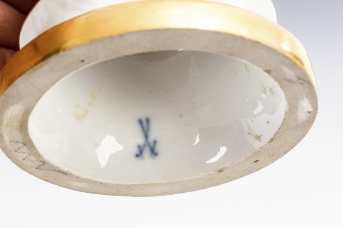 Auf einem gekehlten Rundsockel stehender, sich auf eine Krücke stützender Amorknabe in zerschlissener Kleidung, sein angewinkeltes linkes Bein auf einen Holzstumpf legend, seinen Hut in bittender Gebärde haltend.