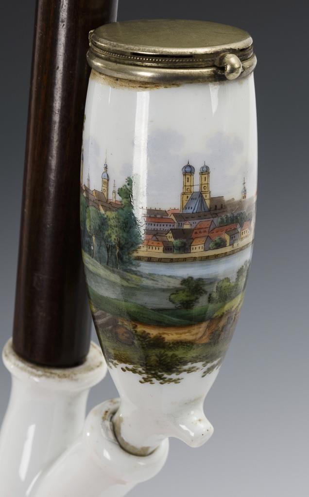 Pfeifenkopf mit metallmontiertem Scharnierdeckel und der umlaufenden Ansicht der Stadt München, mit Saftsack, Holm und Mundstück.