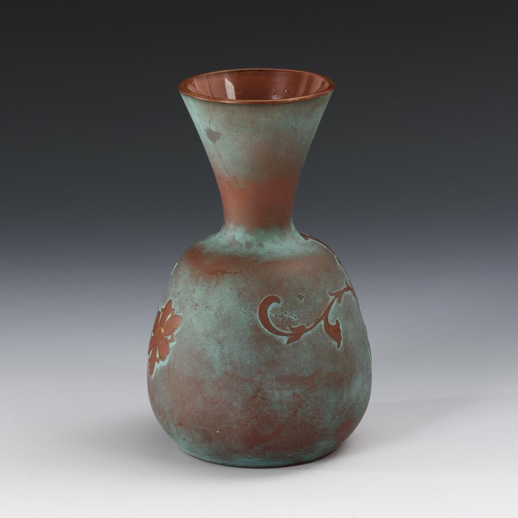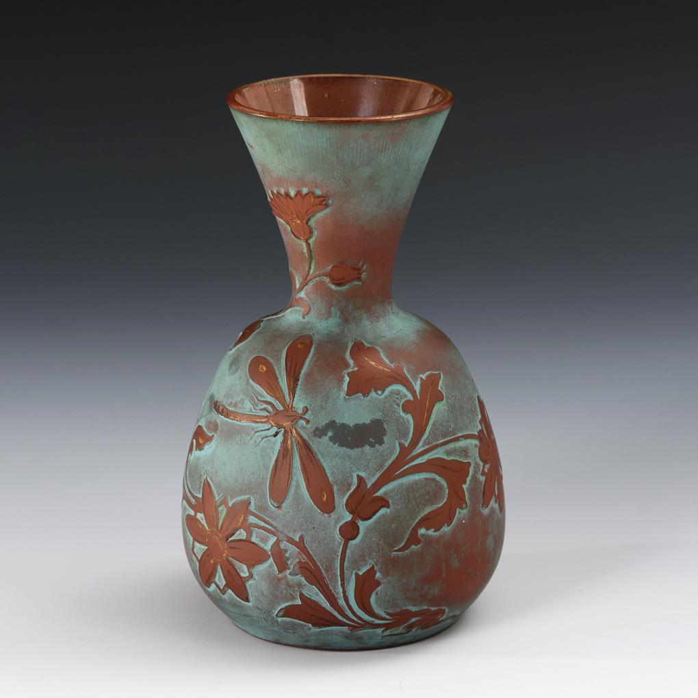 Bauchige Vase mit Kraterhals. Schauseitig geätzte Blumenstängel mit einer Libelle. Gold berieben, 1 Kratzer auf der Farbe.