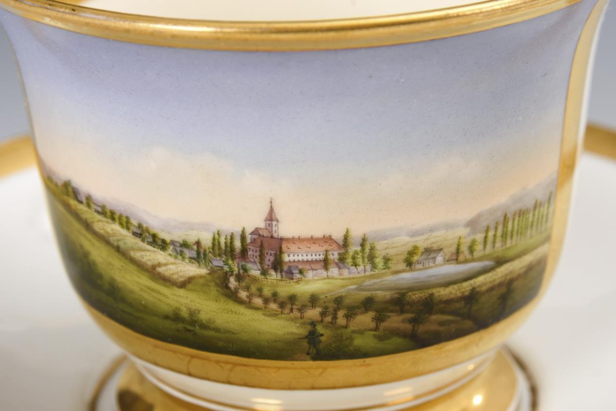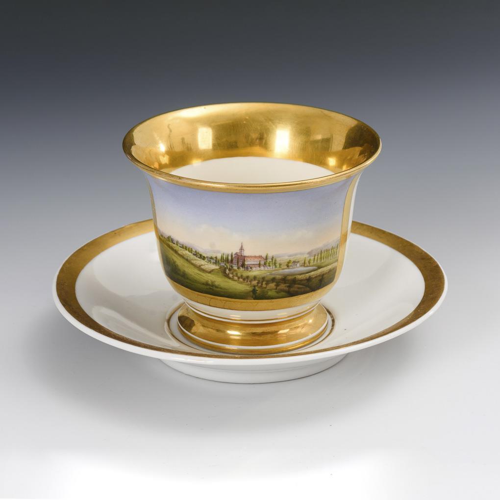 Gefußte Glockentasse mit Ohrenhenkel. Schauseitig eine goldgerahmte Kartusche mit der Ansicht eines Klosters in einer weiten Landschaft.