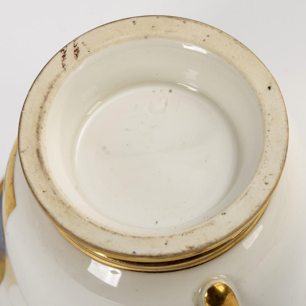 Polychrom bemalt, goldstaffiert. H Tasse 8,5 cm, Ø ergänzte Untertasse 17 cm.