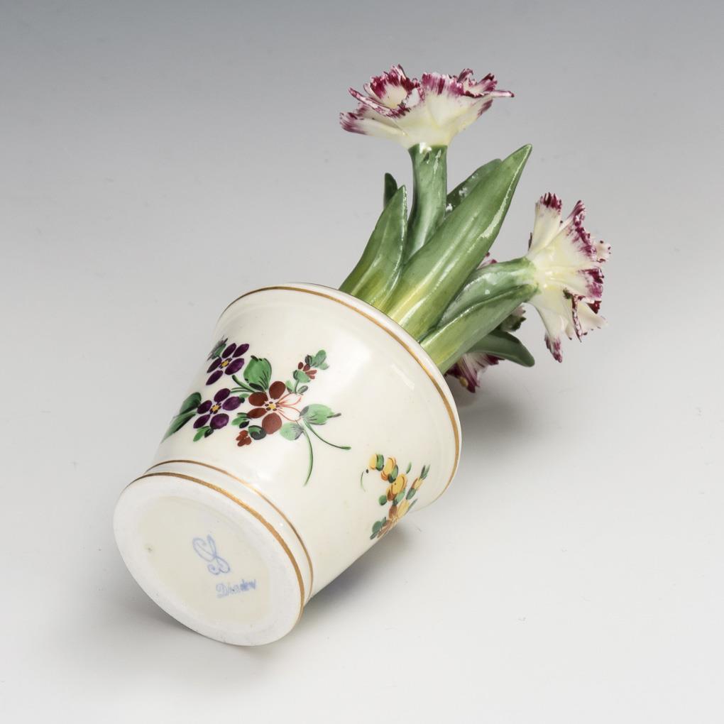 Konischer Blumentopf mit einer Nelkenpflanze als Tischdekoration. 1 Blatt und 3 Blütenblätter bestoßen, 3 Blätter geklebt.