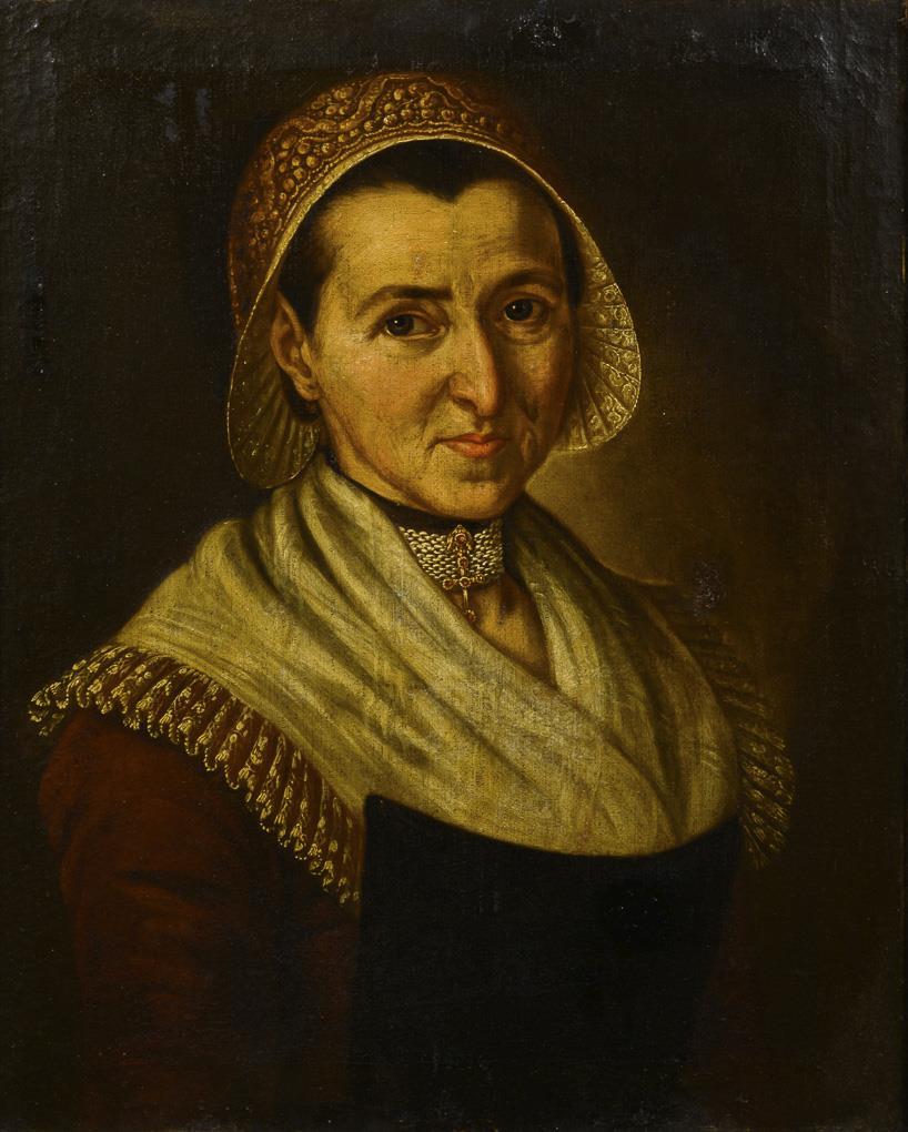 Porträt einer Frau mit verzierter Kopfbedeckung und Goldschmuck. Eine restaurierte Stelle mit Hinterklebung.