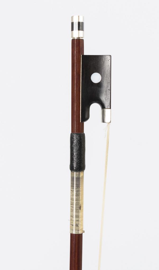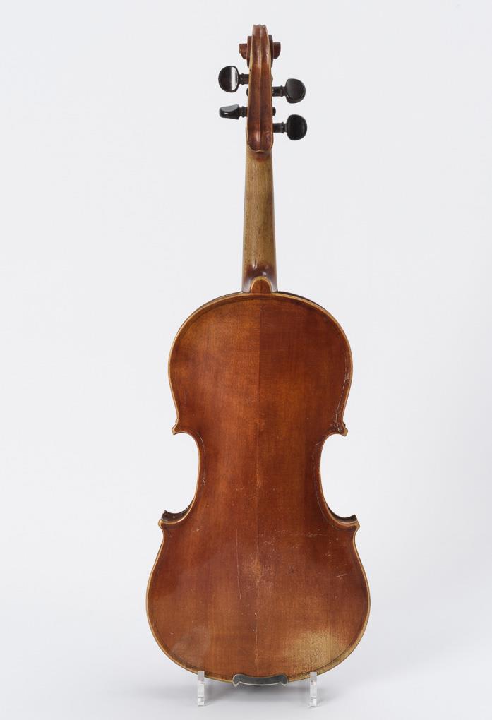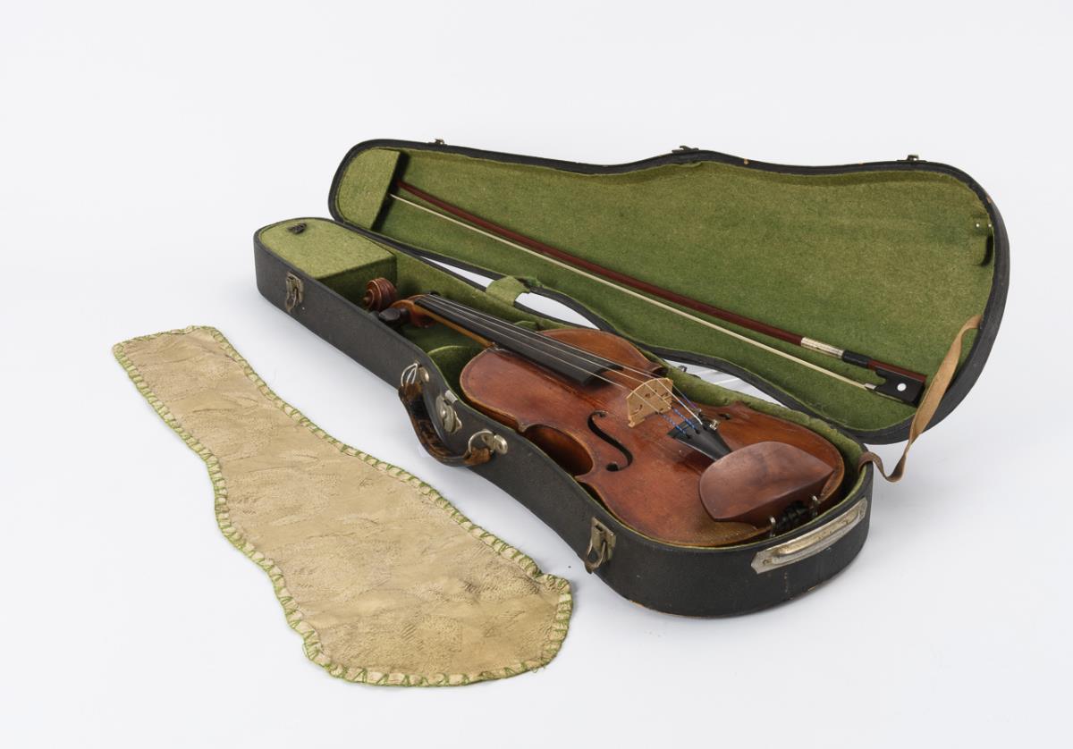 Geige mit Kinnstütze. Ungemarkter Bogen wohl aus Brasilholz. Schwarzer Kasten. Restauriert, restaurierungsbedürftig, defekter Koffer.