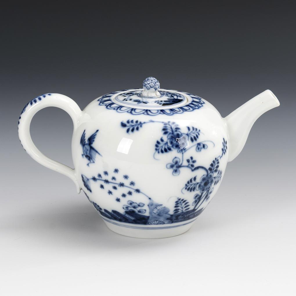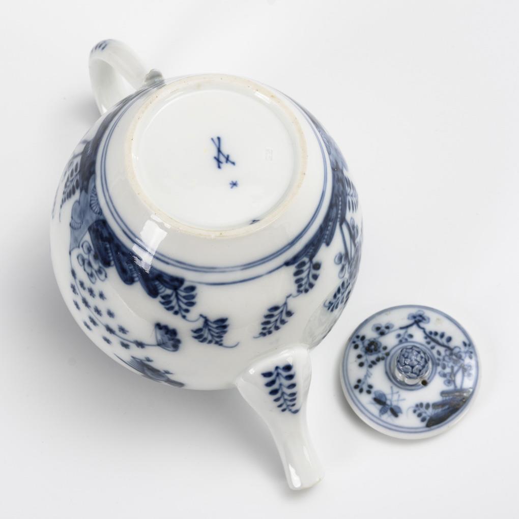 Teekännchen mit unterglasurblau gemaltem Fels- und Vogelmuster.