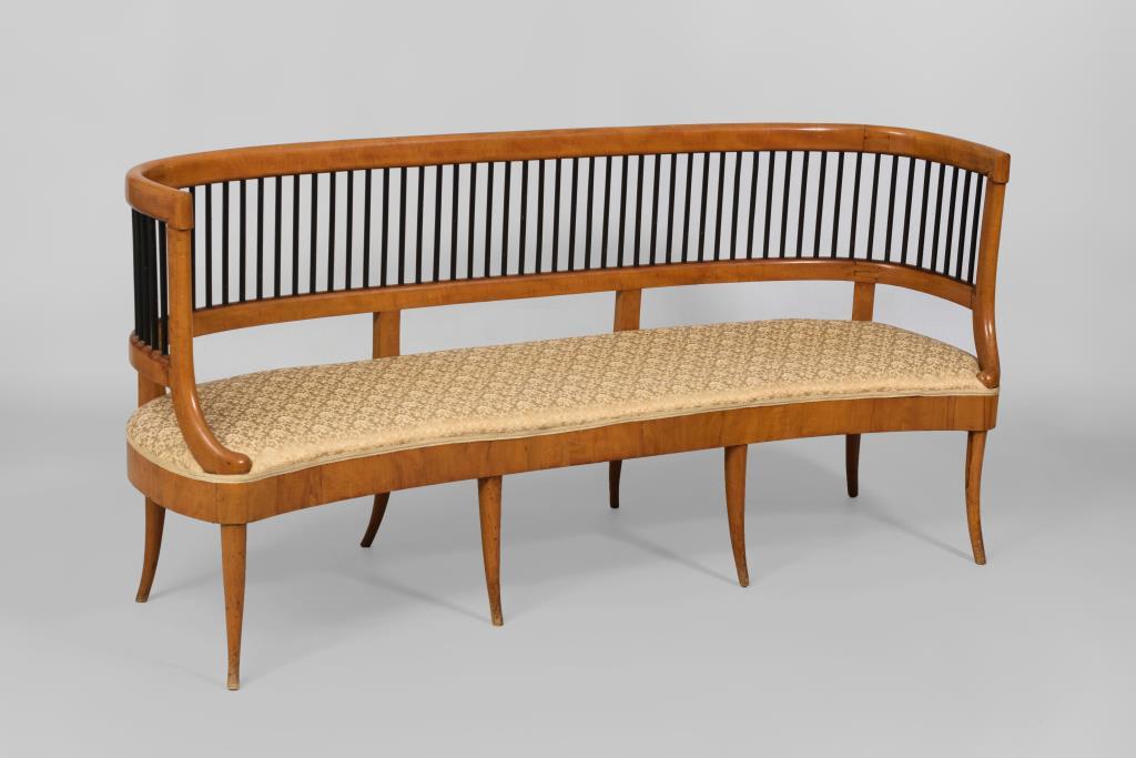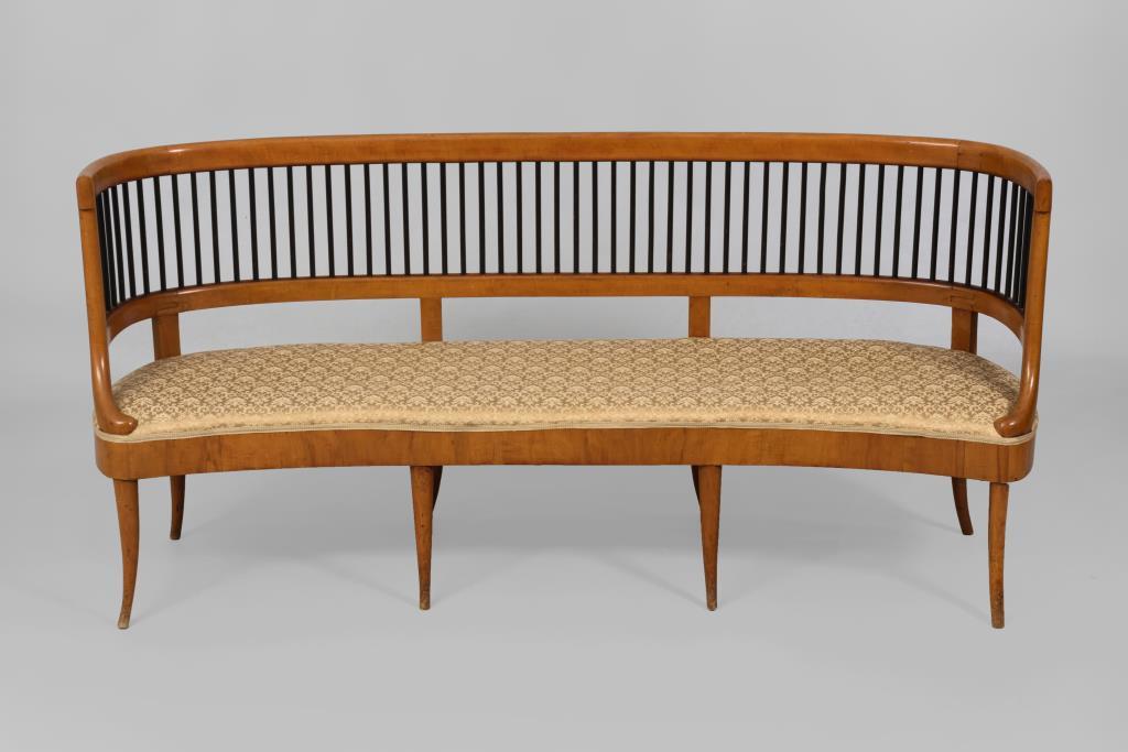 Sitzbank und 2 Stühle im Design-Jugendstil mit ebonisierter Lehnenverstrebung und konischen, leicht ausgestellten Beinen; Sitzbank mit champagnerfarbenem Bezug und kleinteiligem Floralmuster, Stühle mit gestreiftem champagnerfarbenem Bezug . Alters-/Gebrauchsspuren, Furnier teils mit Ergänzungen, inaktiver Anobienbefall.