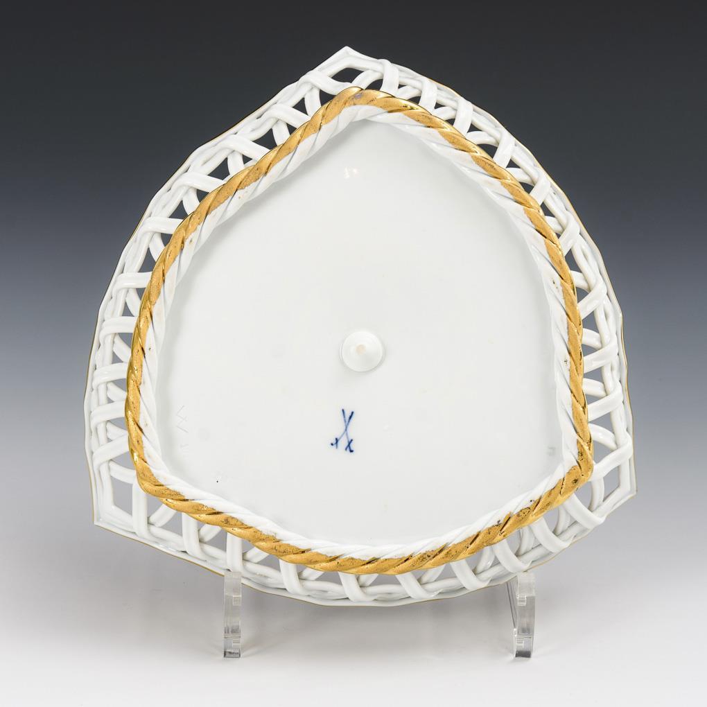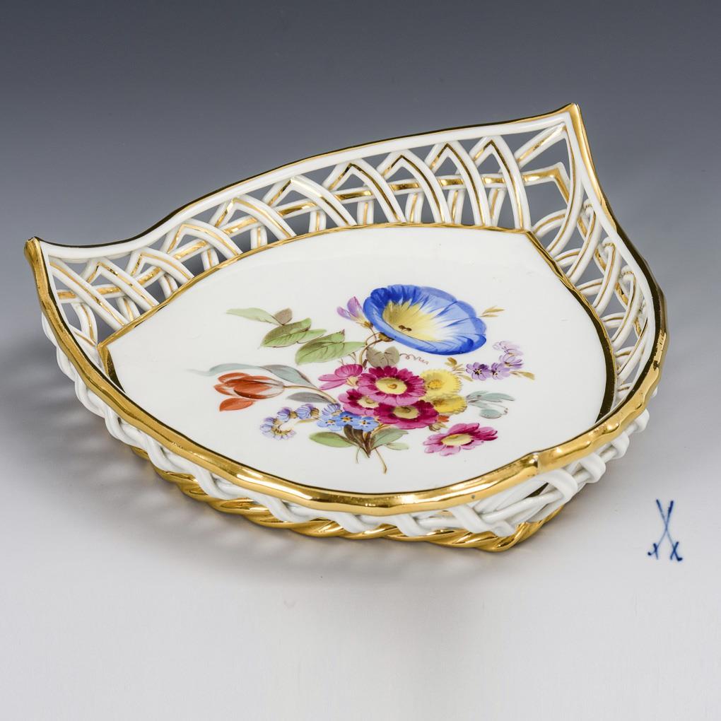 Dreieckige Schale mit spitzbogig geflochtener Fahne. Im Spiegel ein Blumenbukett mit Trichterwinde.