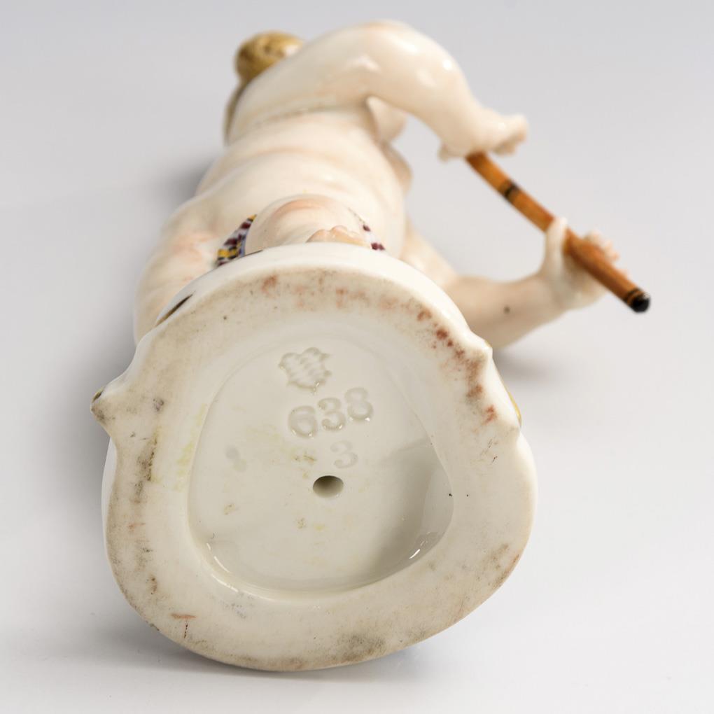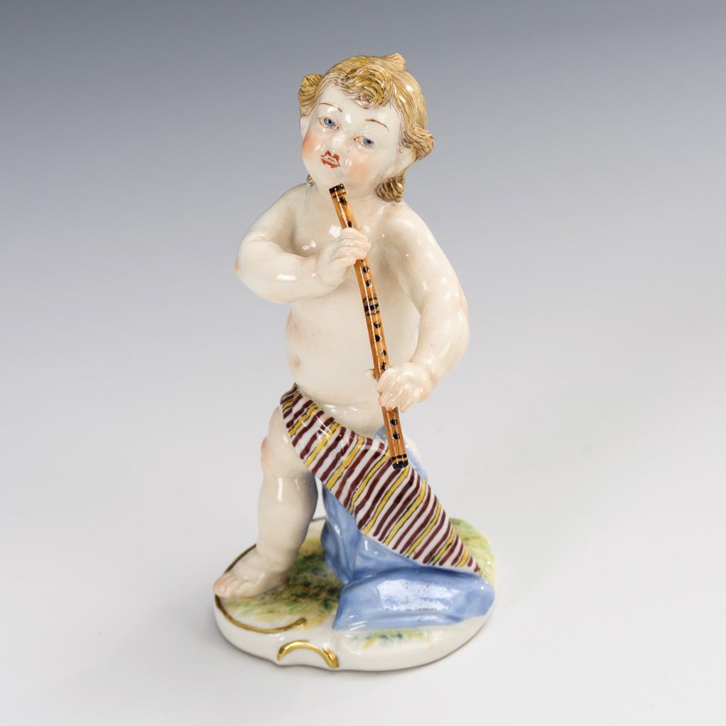 Auf einem Rocaillesockel stehender, eine Flöte spielender Putto. Flötenende restauriert.
