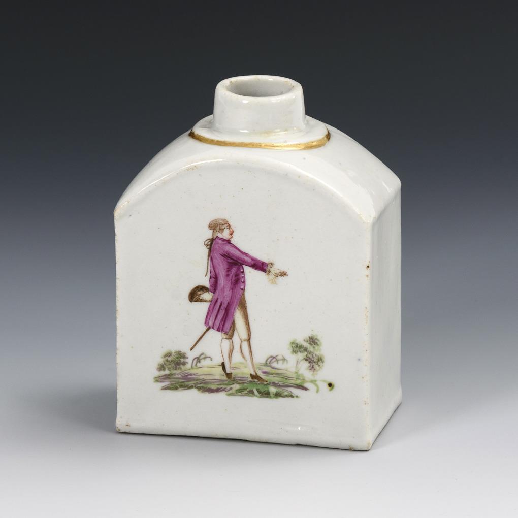 Rechteckige Dose mit der schauseitigen Darstellung eines galanten Paares bzw. eines Kavaliers. Ohne Deckel.