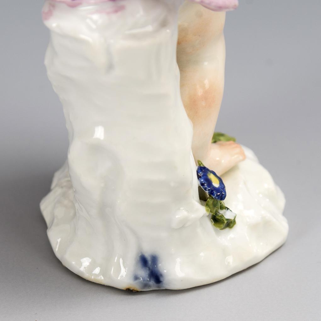Amorette mit Pompadour und Stricknadeln. 1 Blatt bestoßen, 1 Flügel und linke Hand restauriert, minimale Glasurabplatzer.