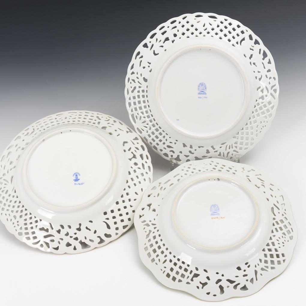 2 + 1 Dessertteller mit blütendurchbrochener Fahne und unterschiedlicher Kakiemonmalerei.