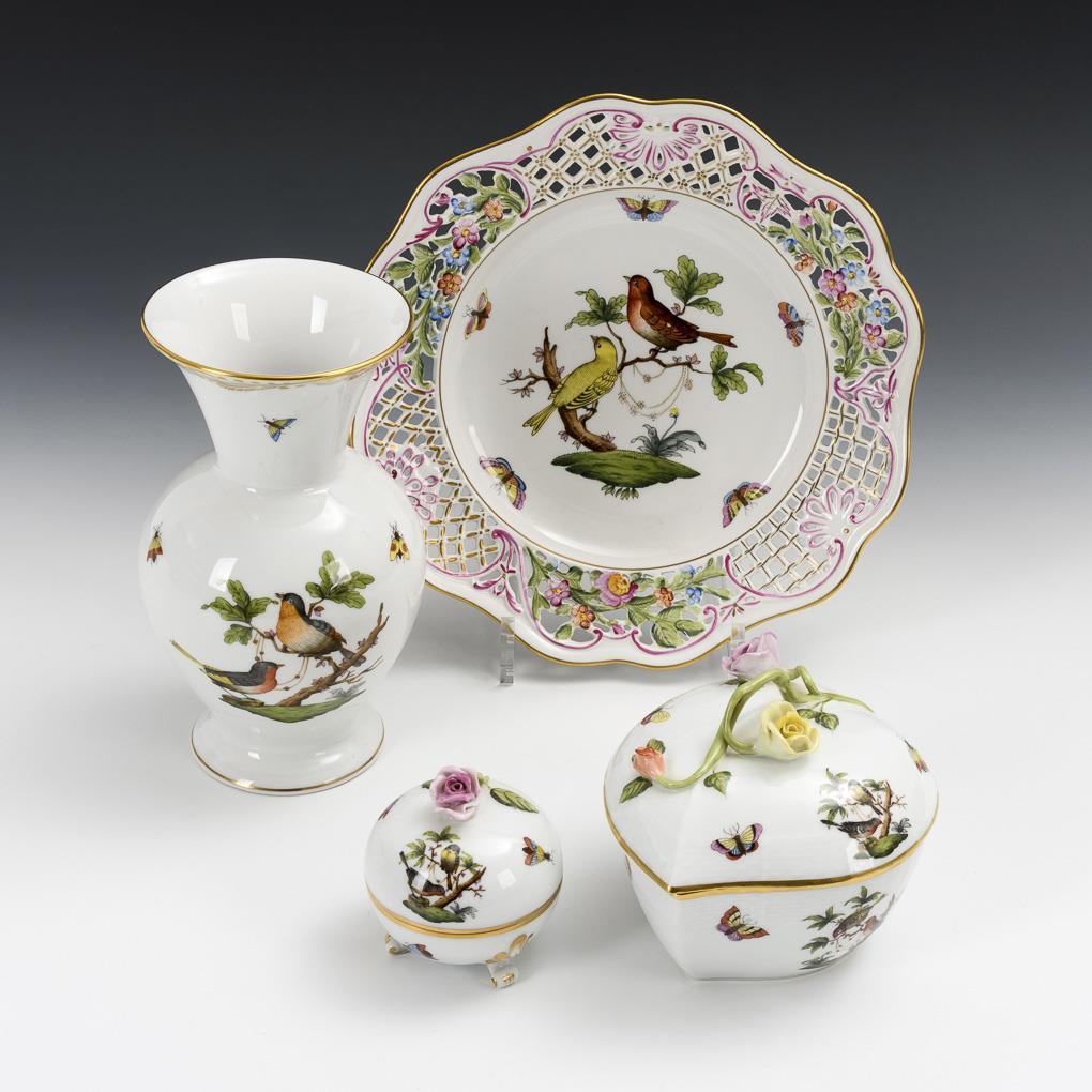 2 Dosen, Durchbruchteller und Vase mit Rothschilddekor. Herend.