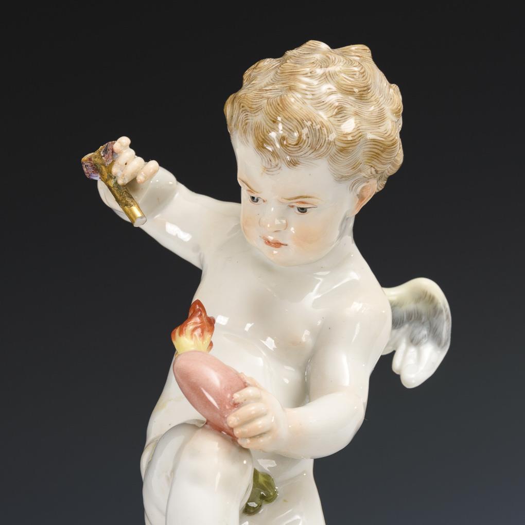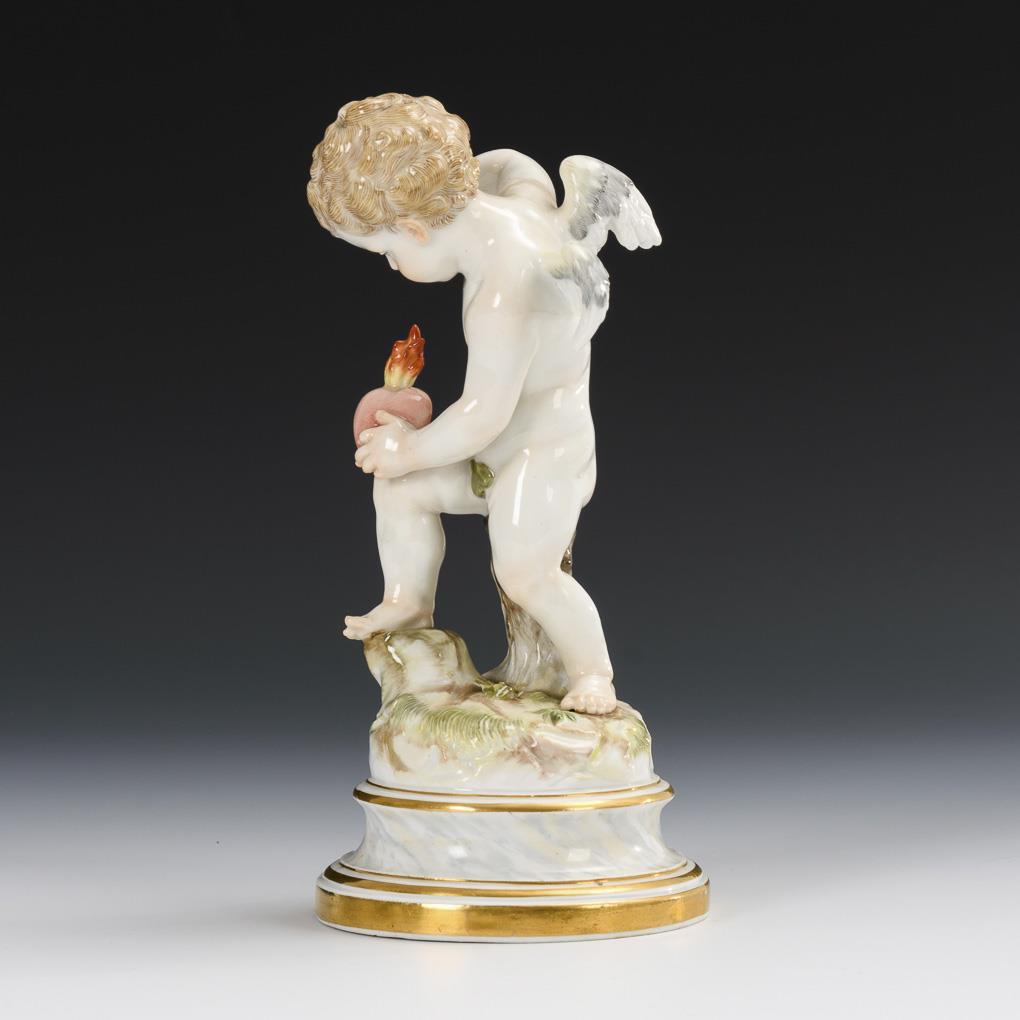 An einem Baumstumpf stehender Amorknabe, mit seinem Pfeil ein flammendes Herz zerstechend. Pfeil defekt.