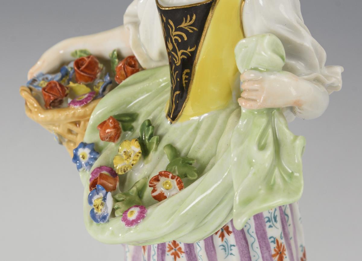 Auf einem Rocaillesockel stehende Gärtnerin mit Blumenkorb. 1 Finger und 1 Blüte bestoßen.