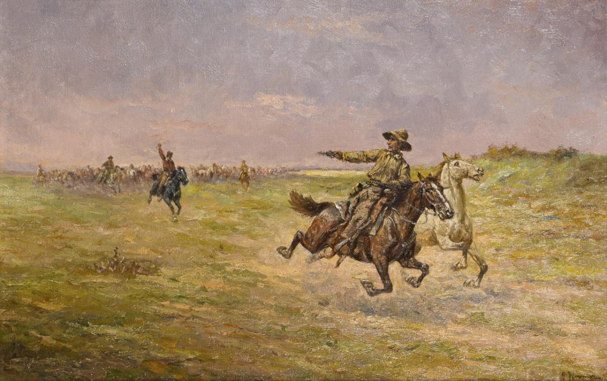 Reiter mit zwei Pferden im schnellen Galopp und nach hinten, auf seine Verfolger gerichtetem Revolver in der weiten Prärie.