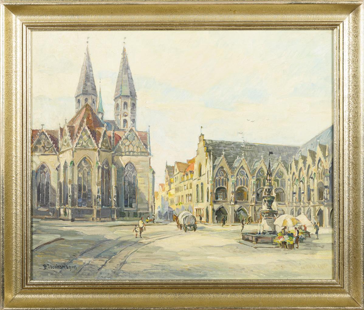 Das Rathaus und St. Martini an einem sonnigen Tag mit Staffagefiguren.
