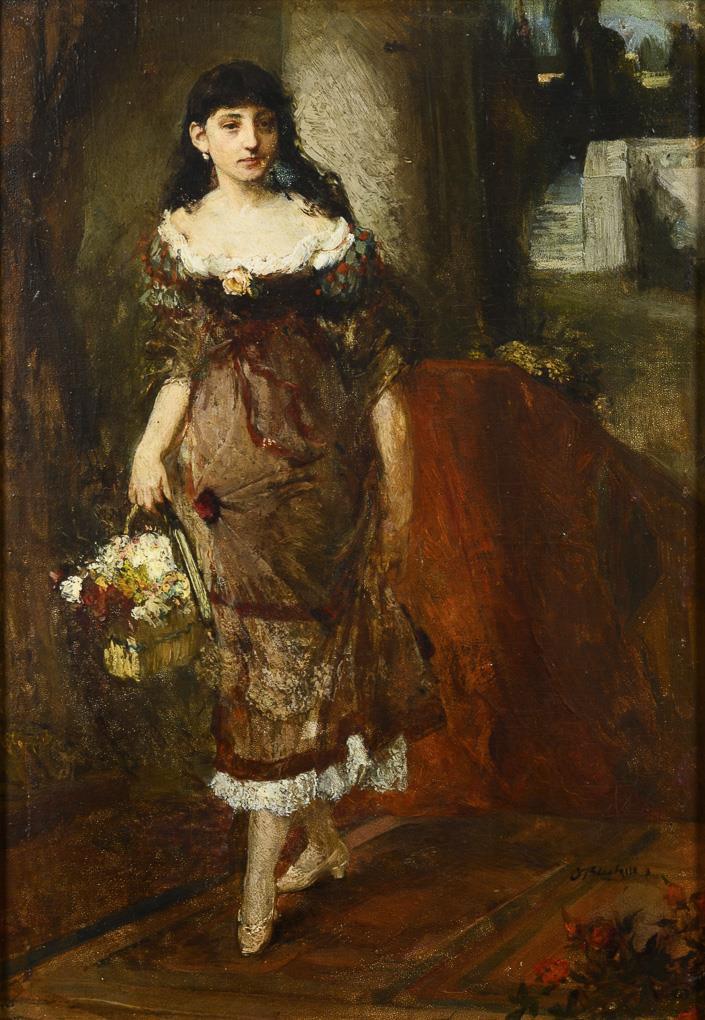 Junge Frau im Kleid und mit Blumenkorb in südlichem Interieur. Leichte Altersspuren.