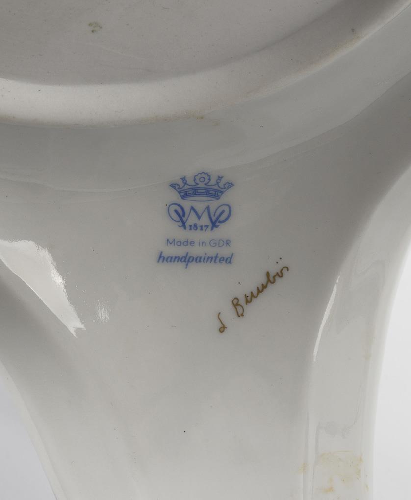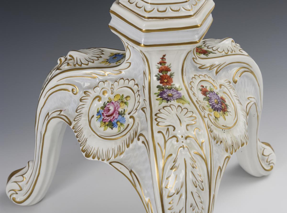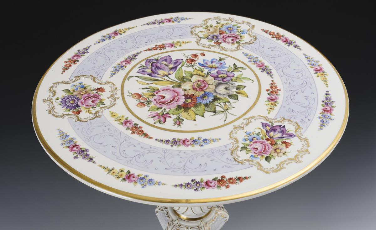 Runde Platte auf mehrfach gegliedertem Rocailleschaft mit dreibeinigem Fuß. Reiche Blumenmalerei, hellblaues Fondband auf der Tischplatte.
