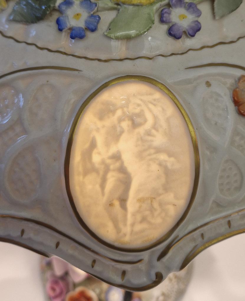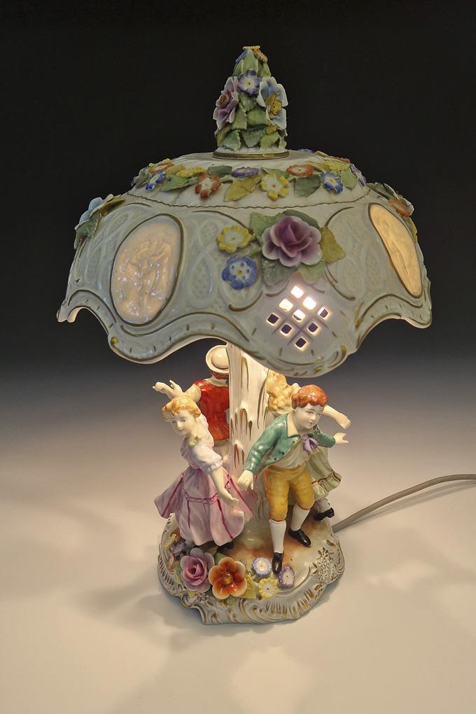 Zwei um einen Baumstamm als Schaft einen Reigen tanzende Kinderpaare, rocaillereliefierter und blütenbelegter Lampenschirm mit vier Lithophaniebildern. Elektrifiziert (Funktion nicht geprüft).