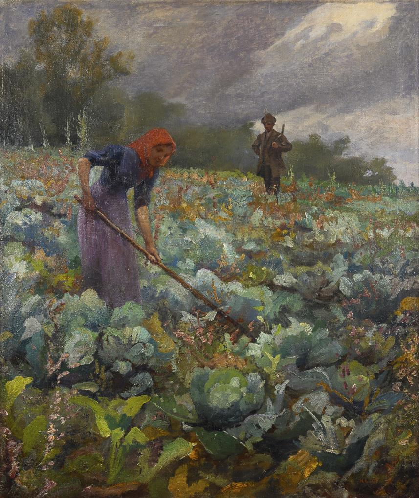 Junge Bäuerin bei der Arbeit auf dem Feld mit nahendem Jäger unter bedecktem Himmel. Leichte Altersspuren.