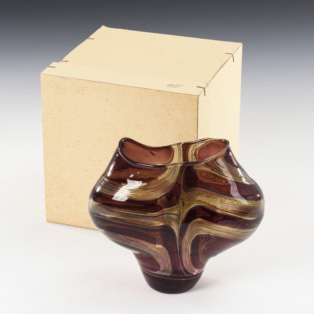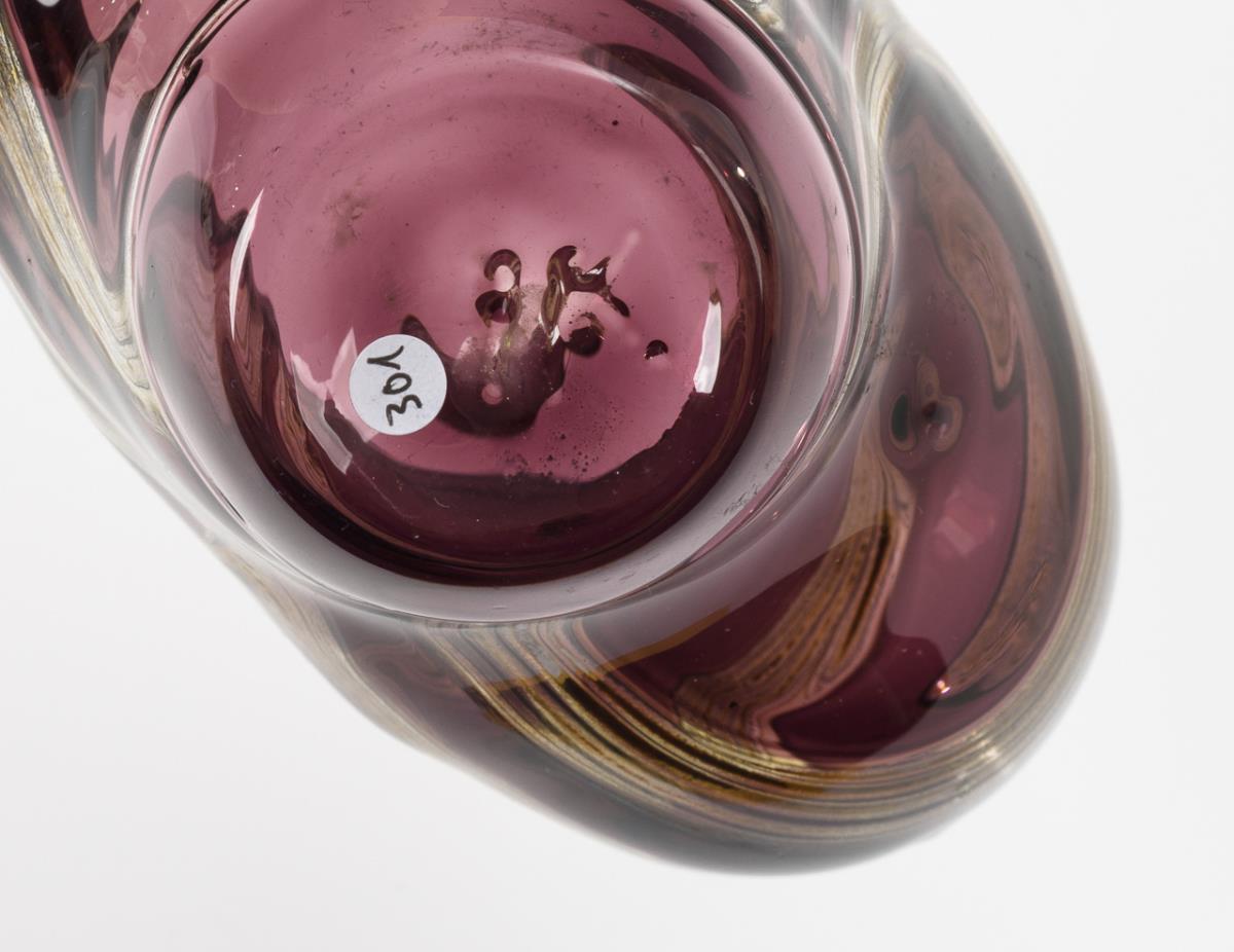 Farbloses und violettes Glas, montiert, vor der Lampe geblasen, schwarz-braunes streifiger Emaildekor. H 14 cm.