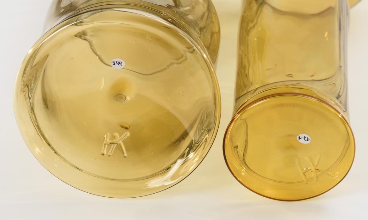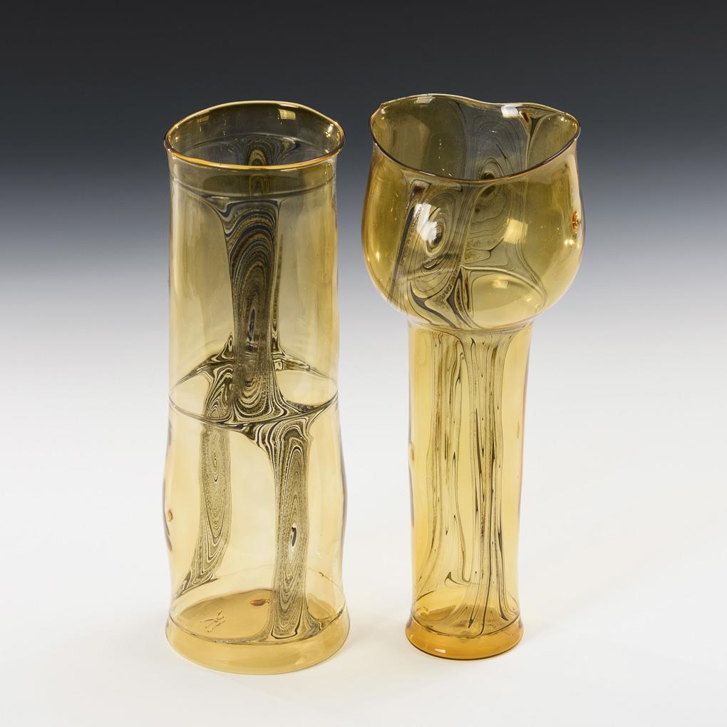 Montiertes und vor der Lampe geblasenes gelbes und farbloses Glas, rauchfarbene Glasemailaufschmelzung. H 33,5 und 34,5 cm.
