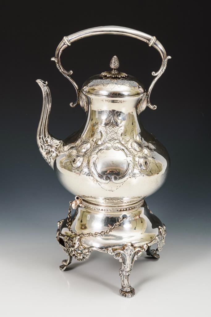 Reich reliefierter, bauchiger Teekessel mit festem Bügelhenkel. Auf versilbertem Rechaud mit Brenner. Dellen, einige alte Lötstellen. Silberne Brennerhalterung ergänzt.