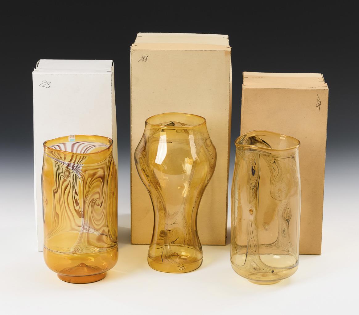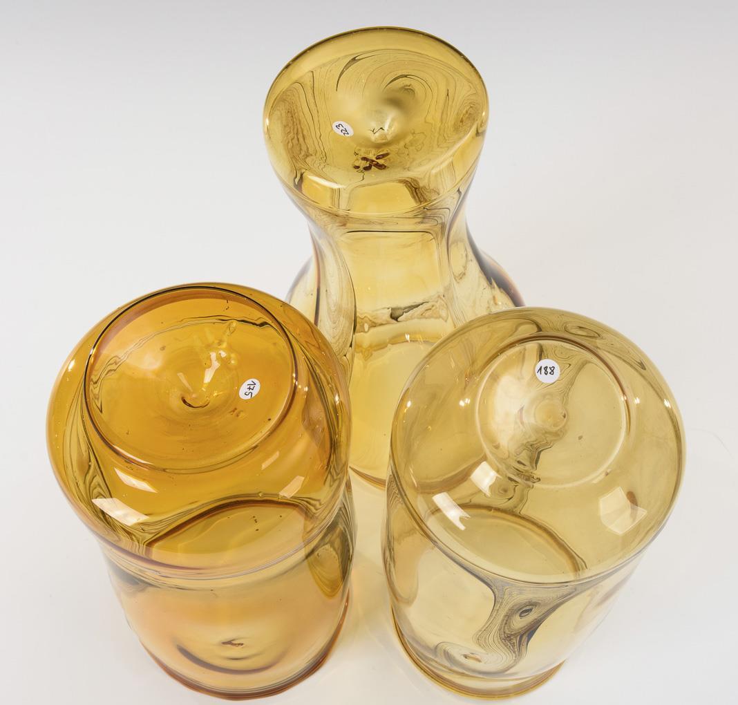 Montiertes und vor der Lampe geblasenes farbloses und gelbes sowie 1x violettes Glas, 2x Aufschmelzung von Glasemail in Braun. H 20 - 22,5 cm.