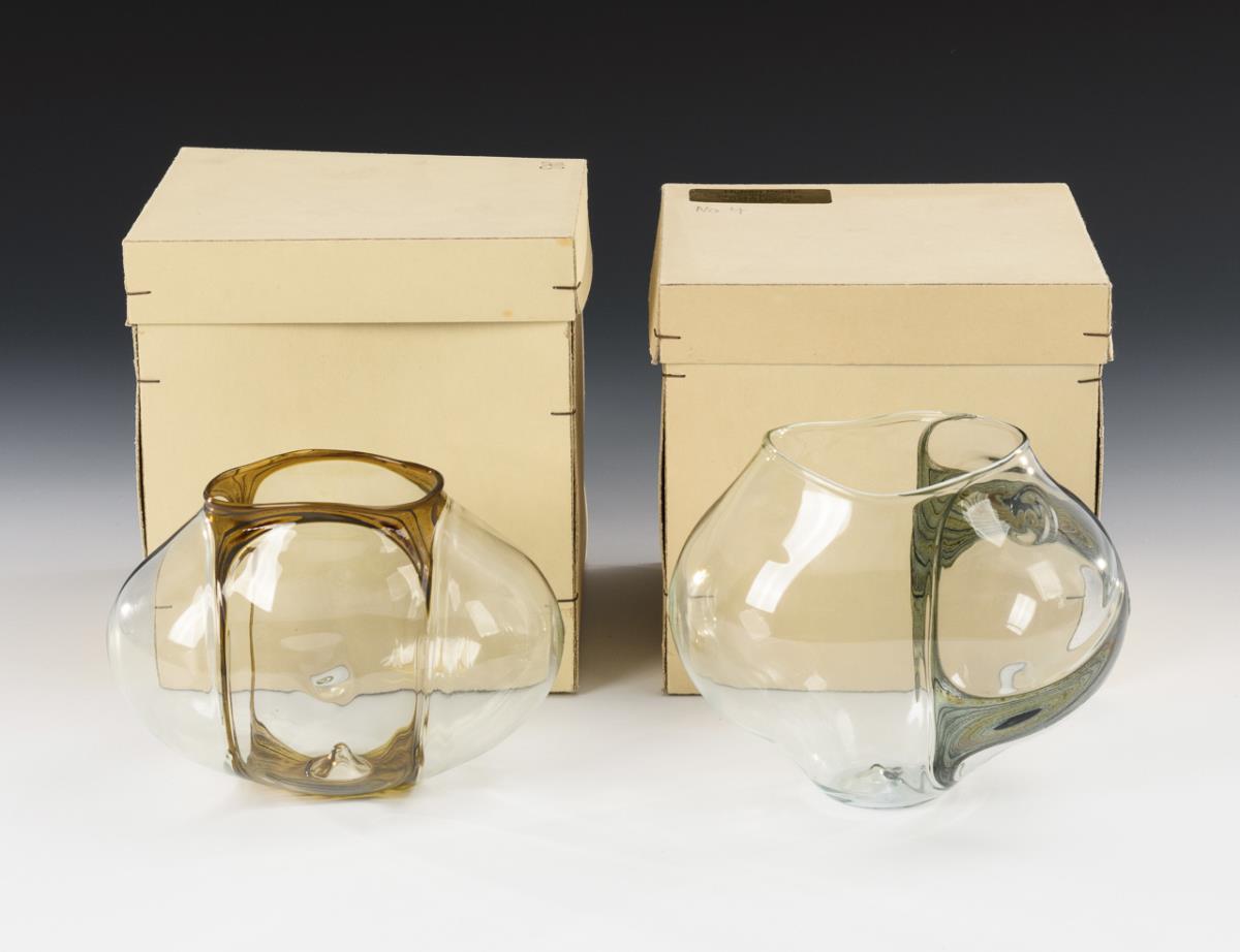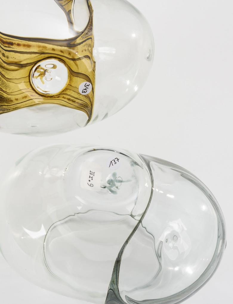 Montiertes und vor der Lampe geblasenes farbloses und bernsteinfarbenes bzw. petrolfarbenes Glas, silbergraue und bernsteinfarbene Glasemailaufschmelzung. H 11 und 13 cm.