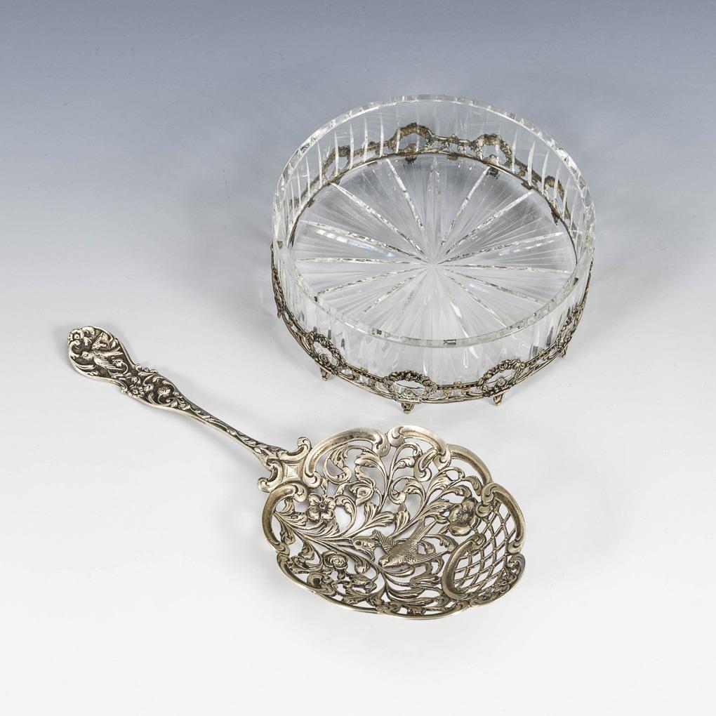 Runde Glasschale mit reliefierter Silbermontierung (ALBO 835 gestempelt). H 5 cm, Ø 14 cm. / Durchbrochen gearbeiteter Heber mit Vogel- und Blütenmotiven (Niederlande, ab 1906 gepunzt). L 23,5 cm, 103 g.