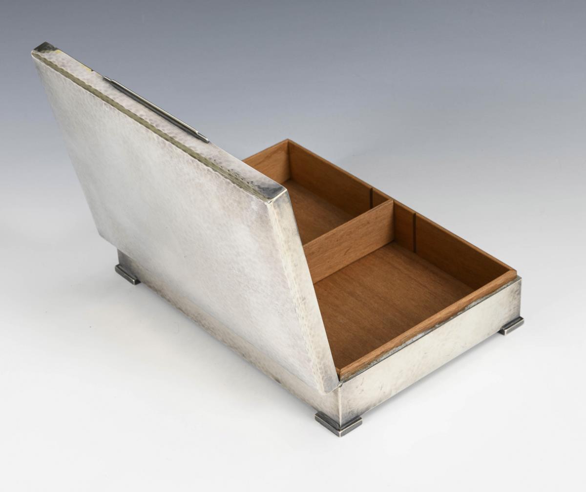 Handgetriebene Schatulle mit Holzauskleidung und Widmungsgravur im Deckel: "Weihnachten 1937, Mutter". Leichte Gebrauchsspuren.