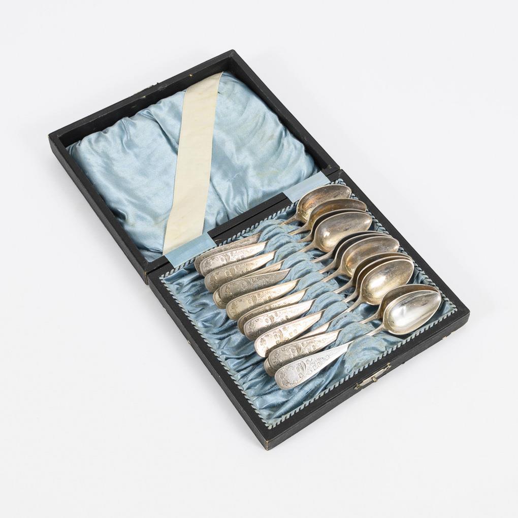 12 gravierte Kaffeelöffel in schwarzer Schatulle.