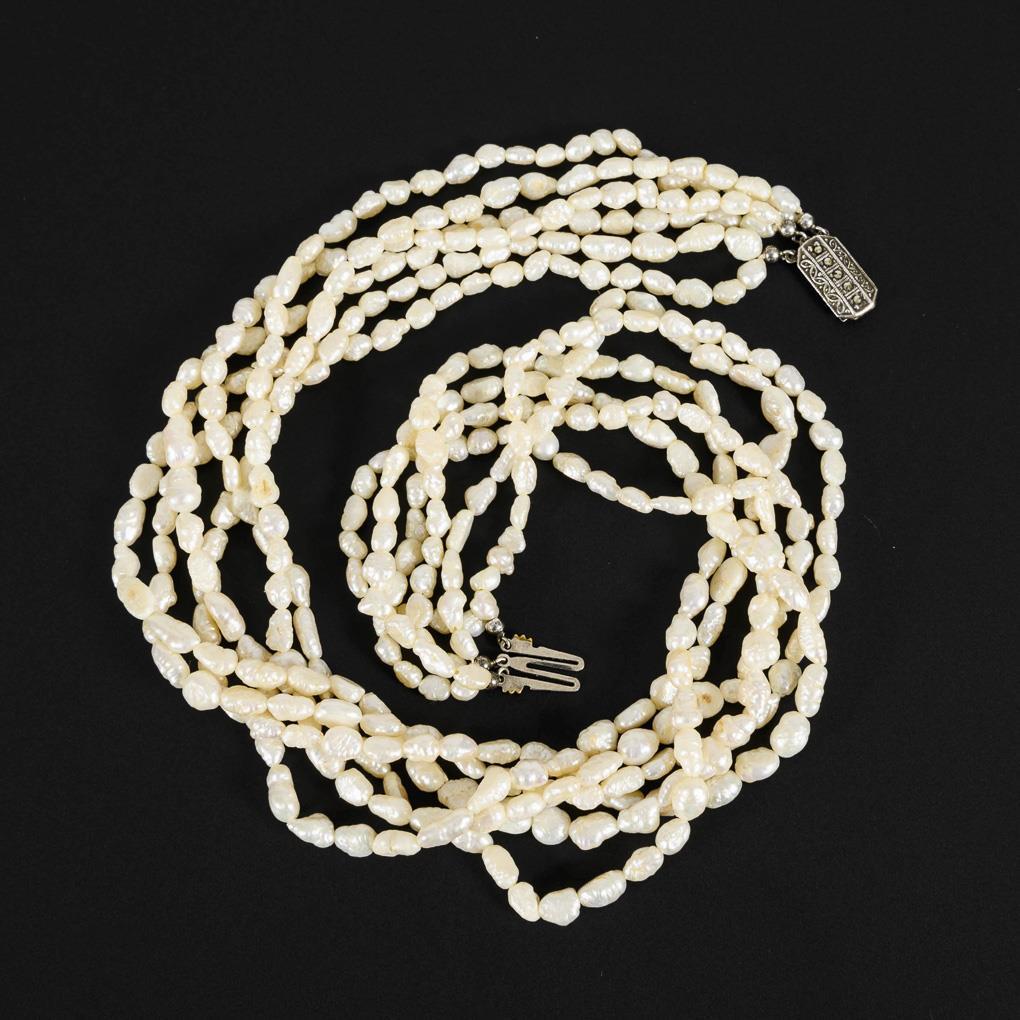 Schnürketten mit reisförmigen Perlen, an Zierschließe mit Markasiten.