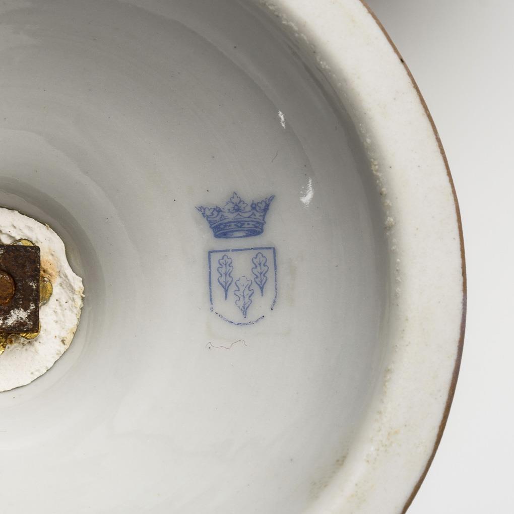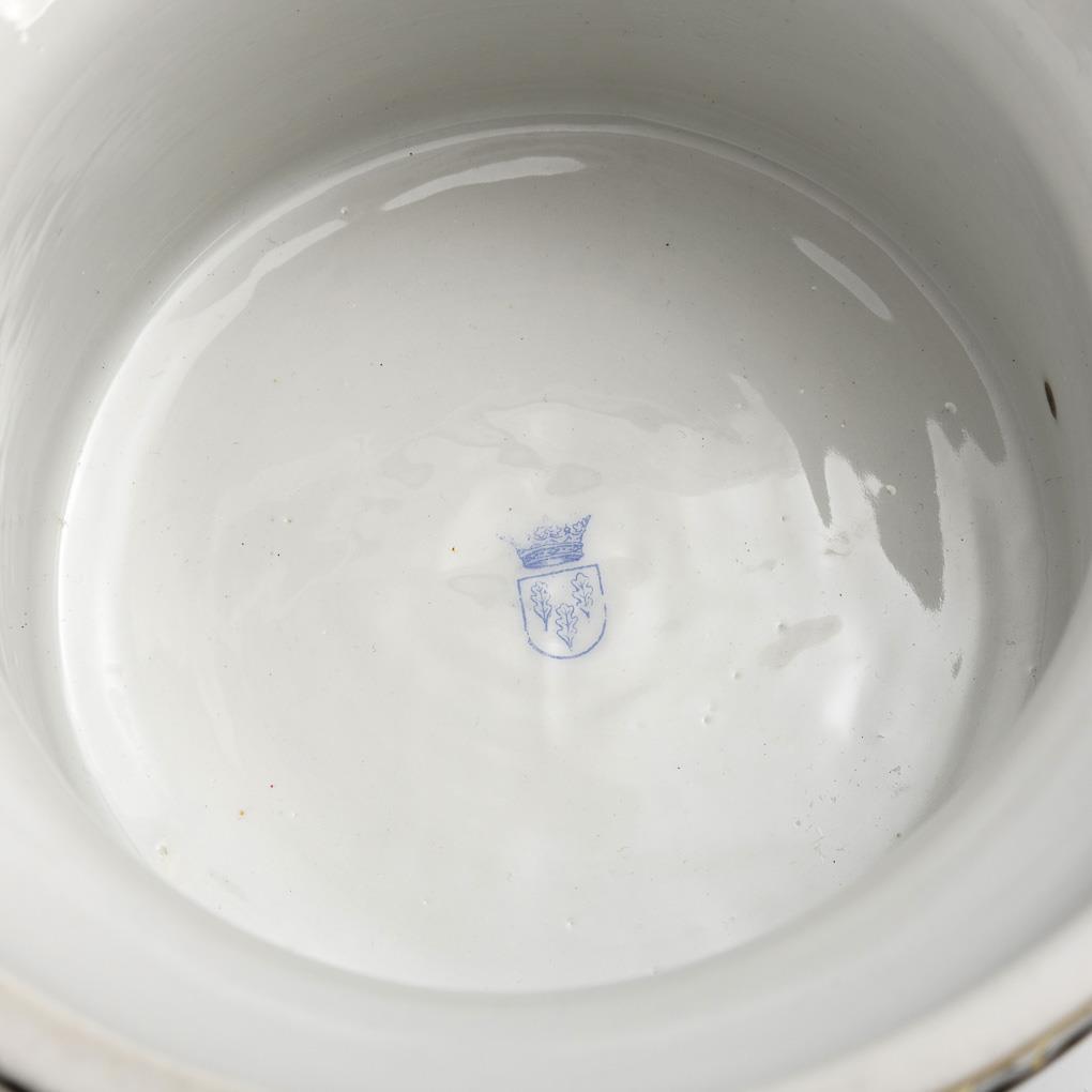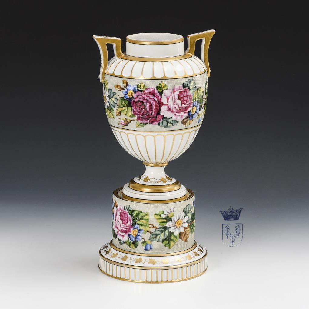 Ovoider Sockel, spitze Ohrenhenkel, Rundfuß; auf zylindrischem Sockel mit kanneliertem Stand. Umlaufend auf der Vase und dem Sockel ein in Straminoptik reliefiertes Band mit Blumenmalerei. Deckel fehlt, minimaler Goldabrieb.