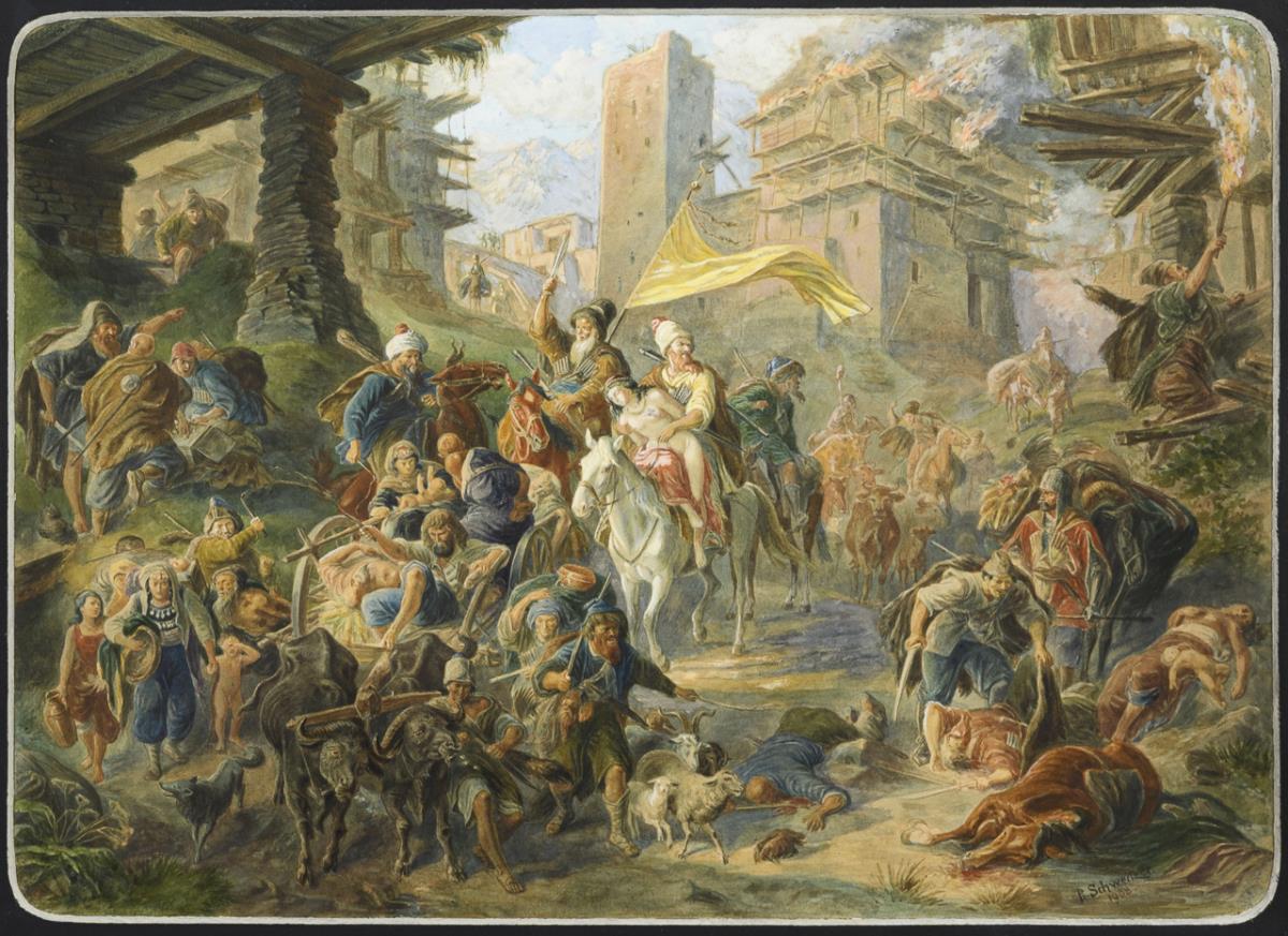 Die Reiter mit wehender Fahne beim Vertreiben der Menschen aus der brennenden Stadt in den Bergen.