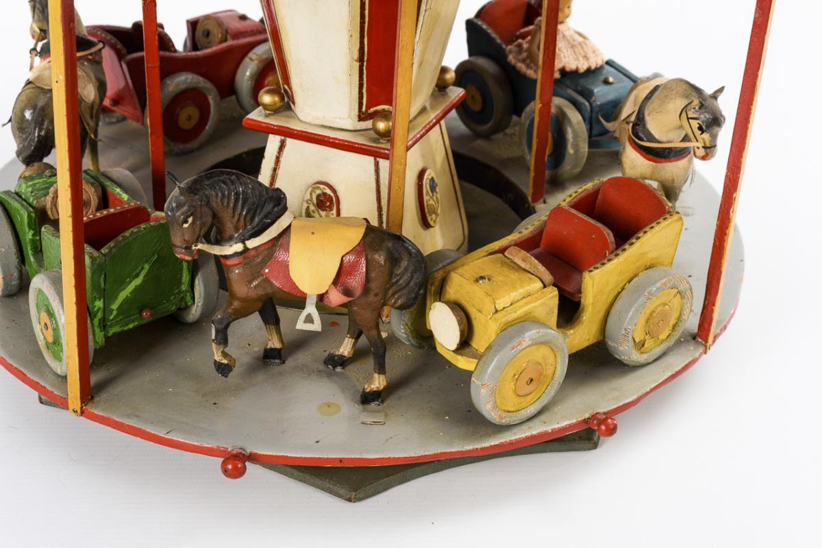 Schönes Kinderkarussell mit Handantrieb, Eigenbau. Bespielt, mit leichten Altersspuren.