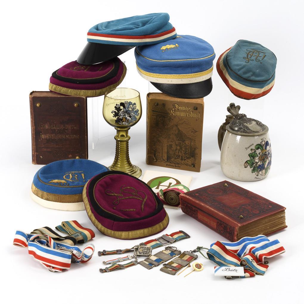 Halbliter-Steinzeugkrug mit gemaltem Verbindungswappen und graviertem Zirkel auf dem Wappen-Zinndeckel sowie Namensliste und Datum 1928 (Isaria Corps München, Ad. Müller München signiert). / Viertelliter-Römer aus grünem Glas mit gemaltem Verbindungswappen und Widmung. / 6 verschiedene Farbbänder, 1x mit Wappenknopf und Schieber. / 6 Mützen. / 6 Zipfel. / 3 Kommersbücher (1895 und 1924, 1x mit Widmung von 1858). Teils starke Alters-/Gebrauchsspuren.