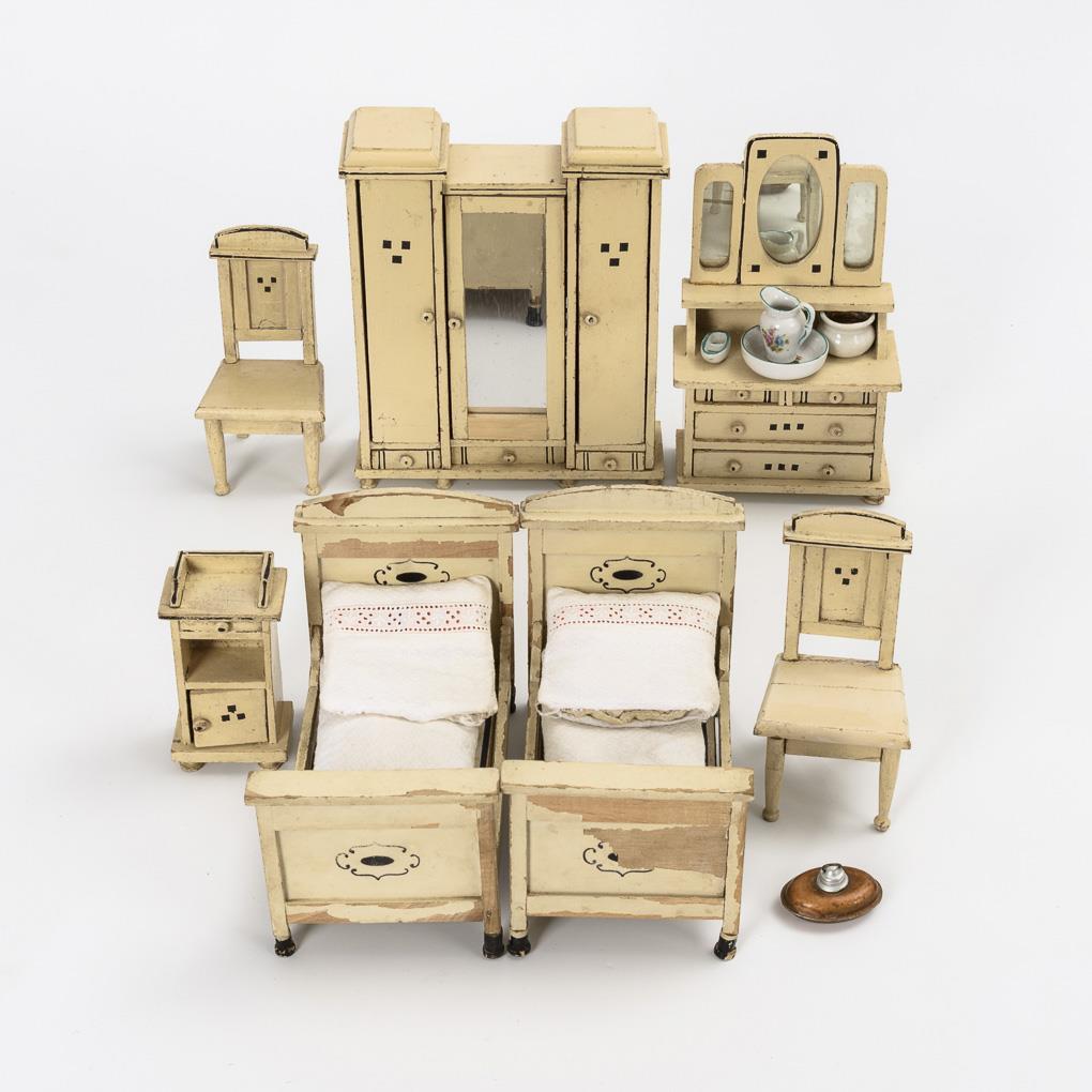 7 weiße Schlafzimmermöbel für die Puppenstube.
