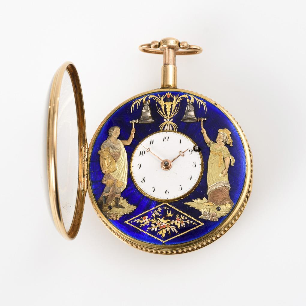 Rundes Gehäuse mit ziseliertem Rückdeckel, leerer Ovalreserve und Münzrand. Transluzidblau emaillierte Front mit beweglichen Figuren in teils antikisierenden Gewändern, 2 Glocken und Floraldekor.